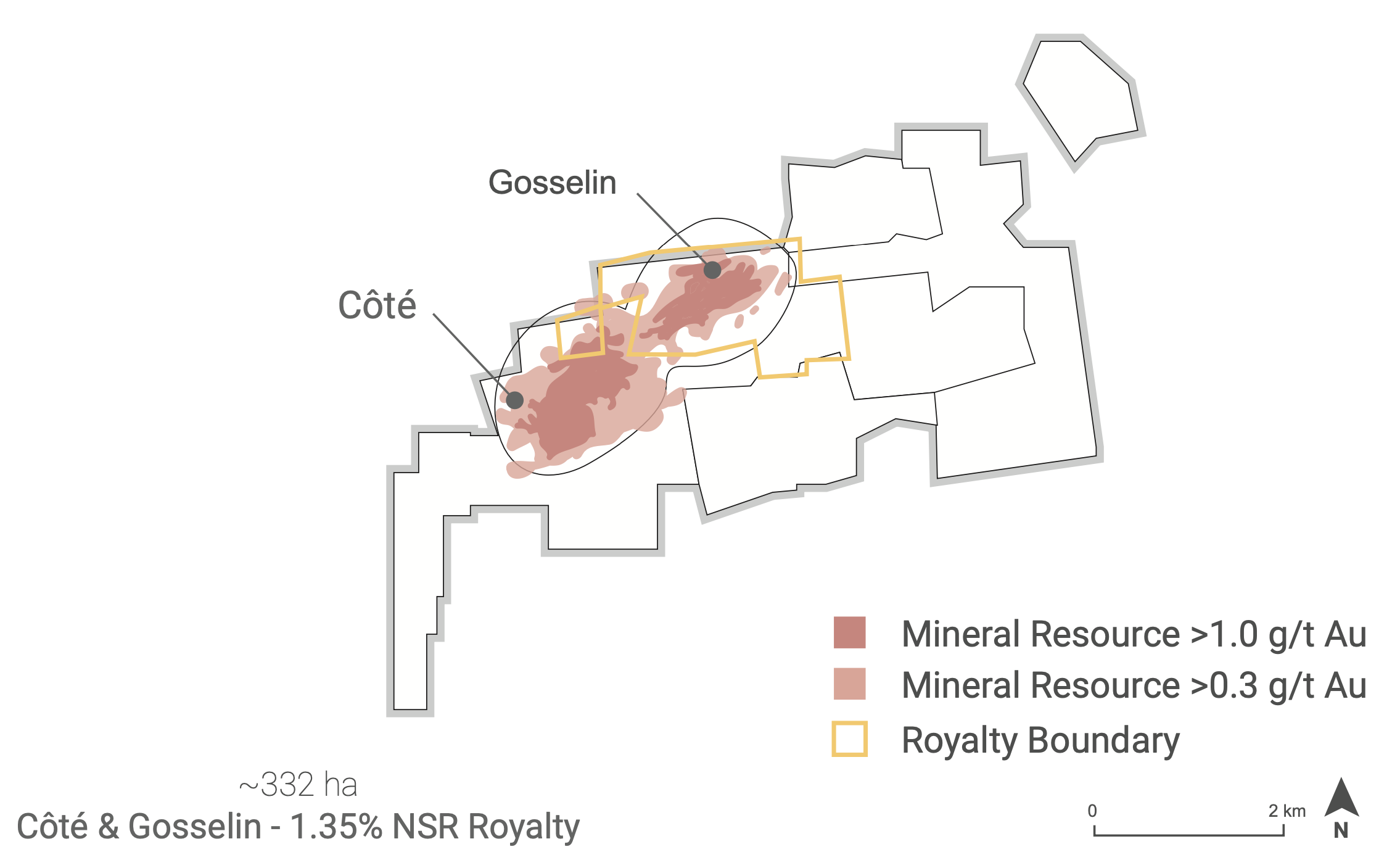 The royalty covers a portion of the northern and north-eastern part of the Côté pit and all of the Gosselin gold project. Gosselin is centered ~1.5km to the northeast of the Côté deposit which IAMGOLD estimates to host a resource estimate of 7.4 Moz of gold. Gosselin was discovered in 2019 and is part of the Côté joint venture between IAMGOLD & Sumitomo. The Gosselin zones exhibit similar geology and metallurgical characteristics, indicating potential for similar gold recoveries to the Côté gold deposit. According to IAMGOLD, Gosselin has the potential to support production levels of ~500koz per year at the Côté operation beyond the first 6 years where production at Côté is expected to drop towards the 365Koz per year average.